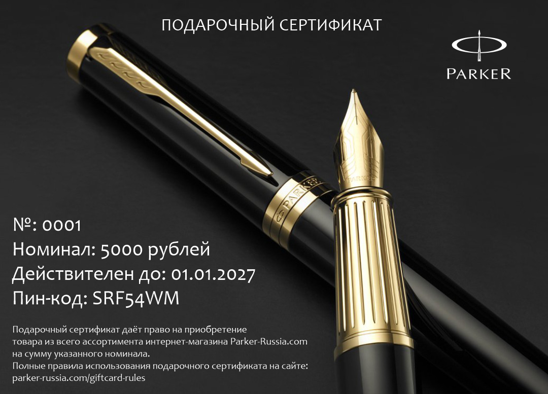 Подарочный сертификат Parker 5000 от официального дилера Parker в Керчи. Вы можете дополнительно заказать гравировку, которая подчеркнет Вашу оригинальность и придаст памятность статусному подарку. Все ручки Паркер поставляются в фирменном футляре.
